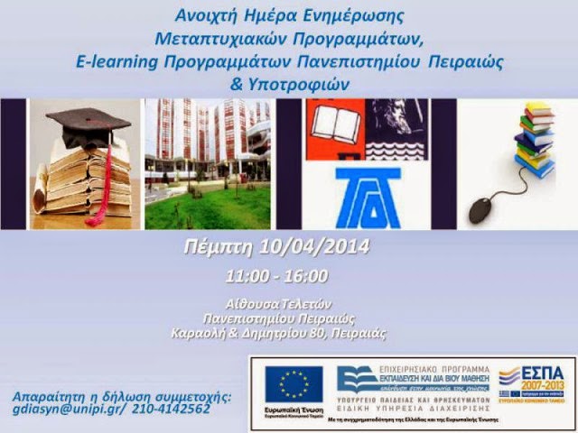 Το Γραφείο Διασύνδεσης του Πανεπιστημίου Πειραιώς διοργανώνει Ημερίδα ενημέρωσης Μεταπτυχιακών Προγραμμάτων, E-learning προγραμμάτων και υποτροφιών.
