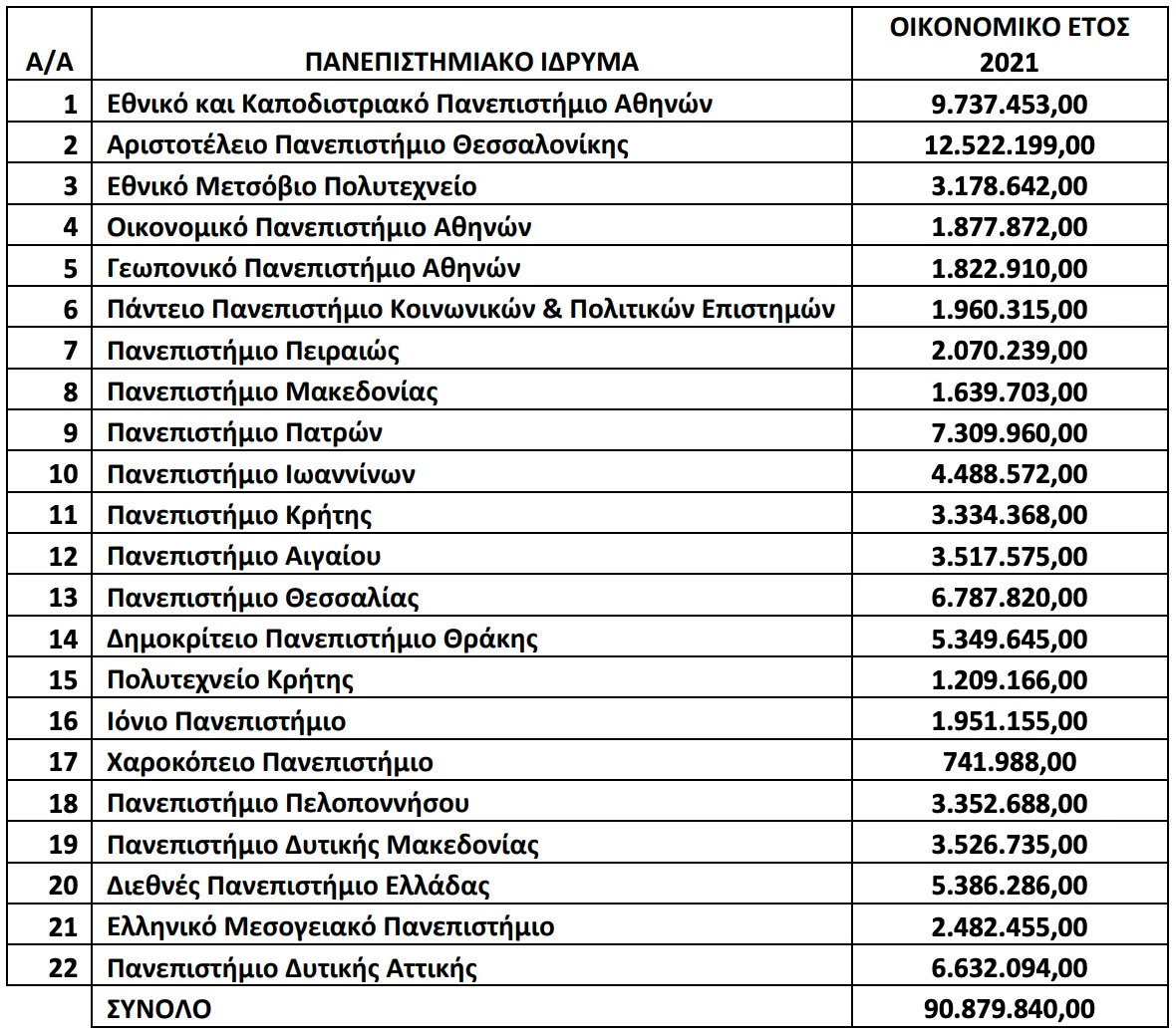 Με σημερινή απόφαση της υπουργού Παιδείας, η οποία το απόγευμα πρόκειται να συνομιλήσει με τους πρυτάνεις στη διαδικτυακή Σύνοδο που οργανώνουν οι τελευταίοι, καθορίστηκε η ετήσια τακτική επιχορήγηση προς τα Πανεπιστήμια της χώρας για την κάλυψη λειτουργικών δαπανών στο ποσό των 90.879.840,00 € σε βάρος της πίστωσης του Α.Λ.Ε. 2310802012 «Επιχορήγηση στα Ανώτατα Εκπαιδευτικά Ιδρύματα (Α.Ε.Ι.) για λειτουργικές δαπάνες γενικά» του Ε.Φ. 1019- 208- 0000000 «Γενική Γραμματεία Ανώτατης Εκπαίδευσης», του προϋπολογισμού του Υπουργείου Παιδείας και Θρησκευμάτων (Υ.ΠΑΙ.Θ.) οικονομικού έτους 2021 και κατανέμεται ως εξής: