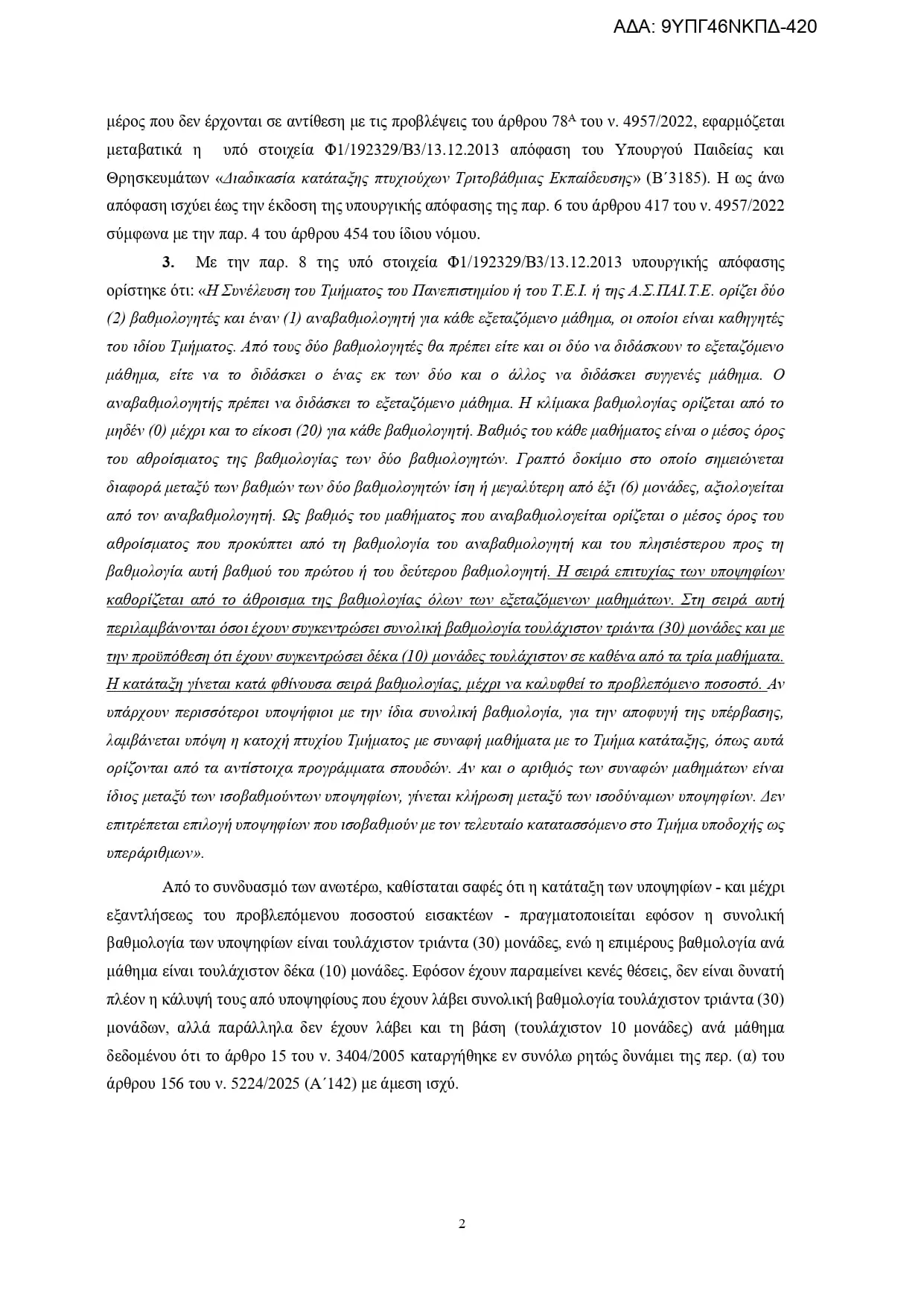 2. Η διαδικασία κατατακτηρίων εξετάσεων σε Τμήματα ή Μονοτμηματικές Σχολές των Ανώτατων Εκπαιδευτικών Ιδρυμάτων διέπεται πλέον από τις διατάξεις του άρθρου 78Α στο ν. 4957/2022, όπως προστέθηκε με το άρθρο 131 του ν. 5224/2025. Συμπληρωματικά και μόνο κατά το μέρος που δεν έρχονται σε αντίθεση με τις προβλέψεις του άρθρου 78Α του ν. 4957/2022, εφαρμόζεται μεταβατικά η υπό στοιχεία Φ1/192329/Β3/13.12.2013 απόφαση του Υπουργού Παιδείας και Θρησκευμάτων «Διαδικασία κατάταξης πτυχιούχων Τριτοβάθμιας Εκπαίδευσης» (Β΄3185). Η ως άνω απόφαση ισχύει έως την έκδοση της υπουργικής απόφασης της παρ. 6 του άρθρου 417 του ν. 4957/2022 σύμφωνα με την παρ. 4 του άρθρου 454 του ίδιου νόμου.