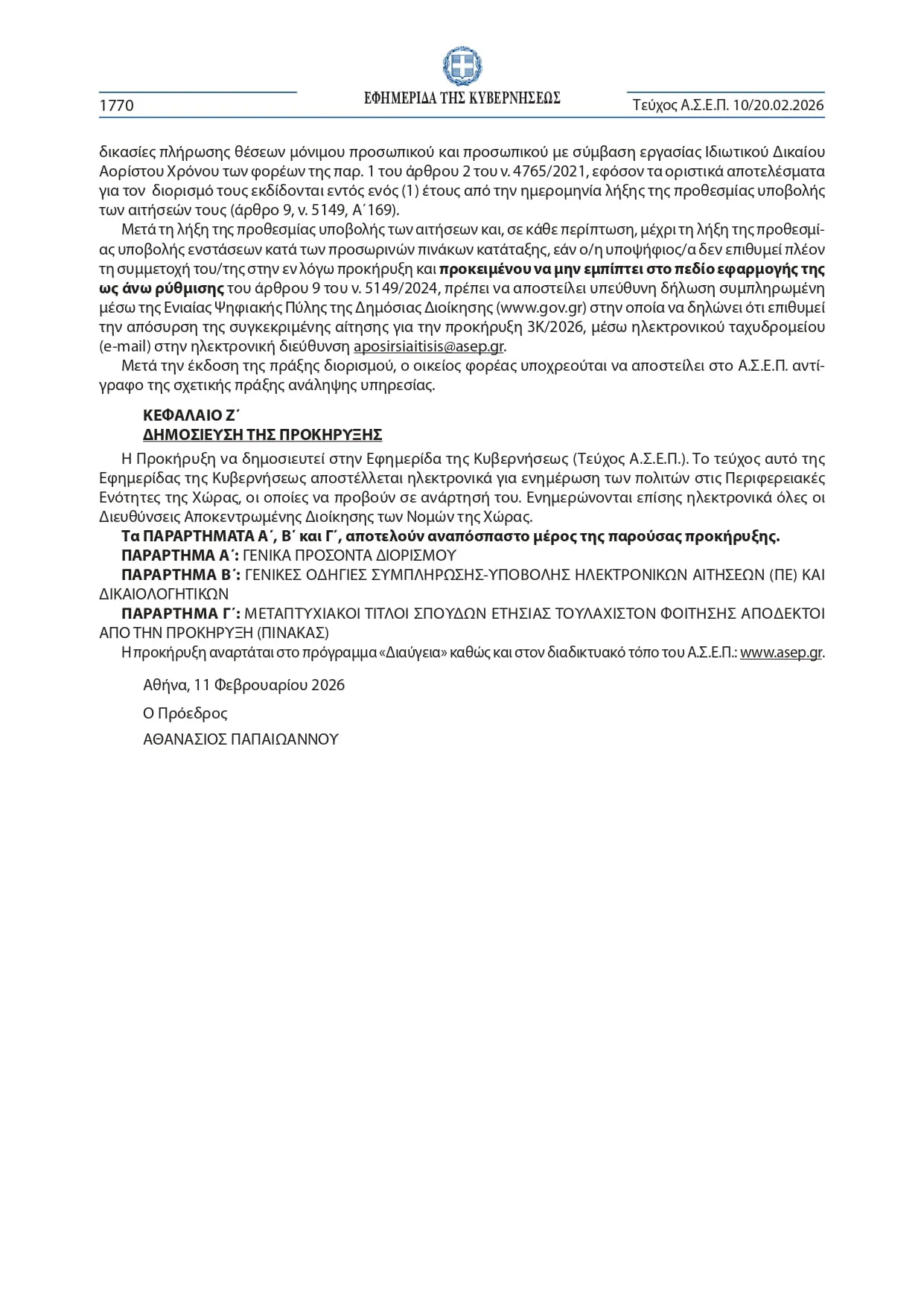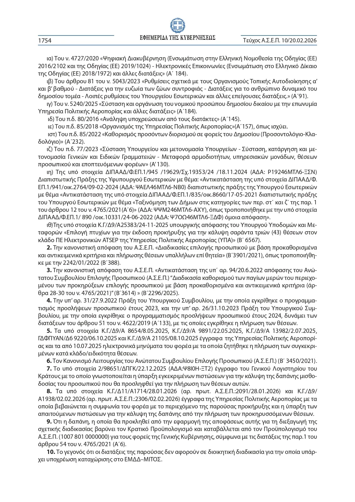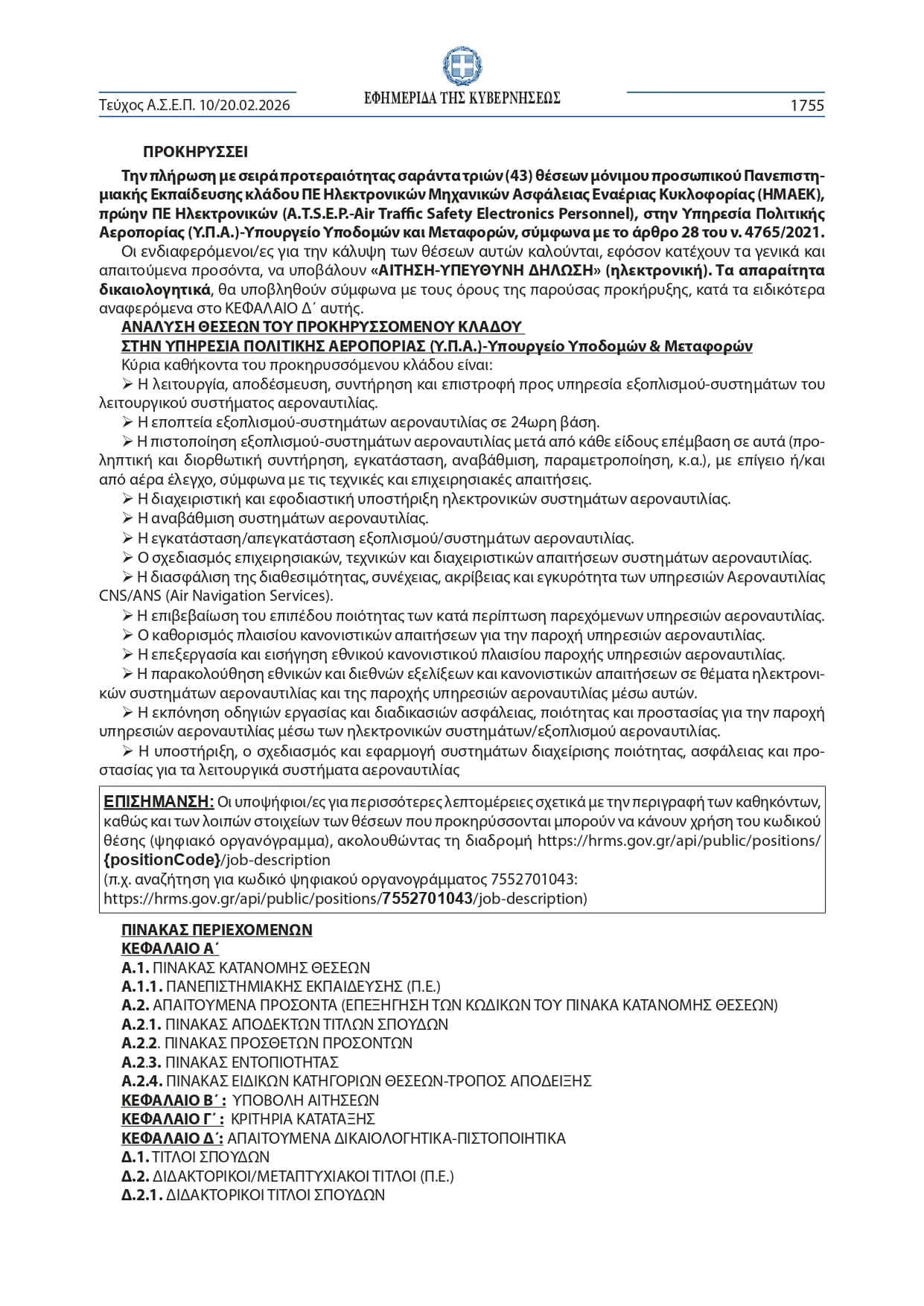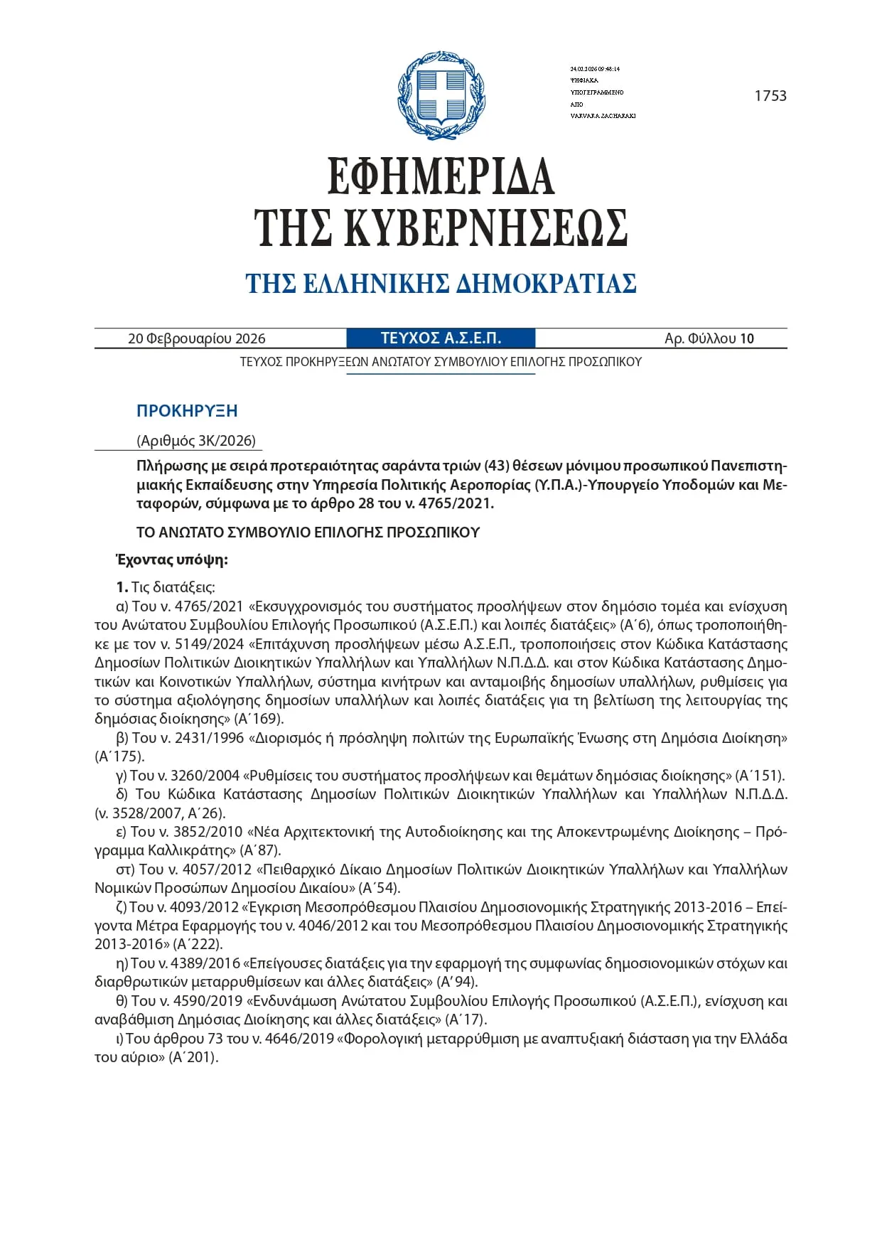 ΑΣΕΠ 3Κ/2026: Στο ΦΕΚ 43 μόνιμες προσλήψεις στην ΥΠΑ – Πότε ξεκινούν οι αιτήσεις