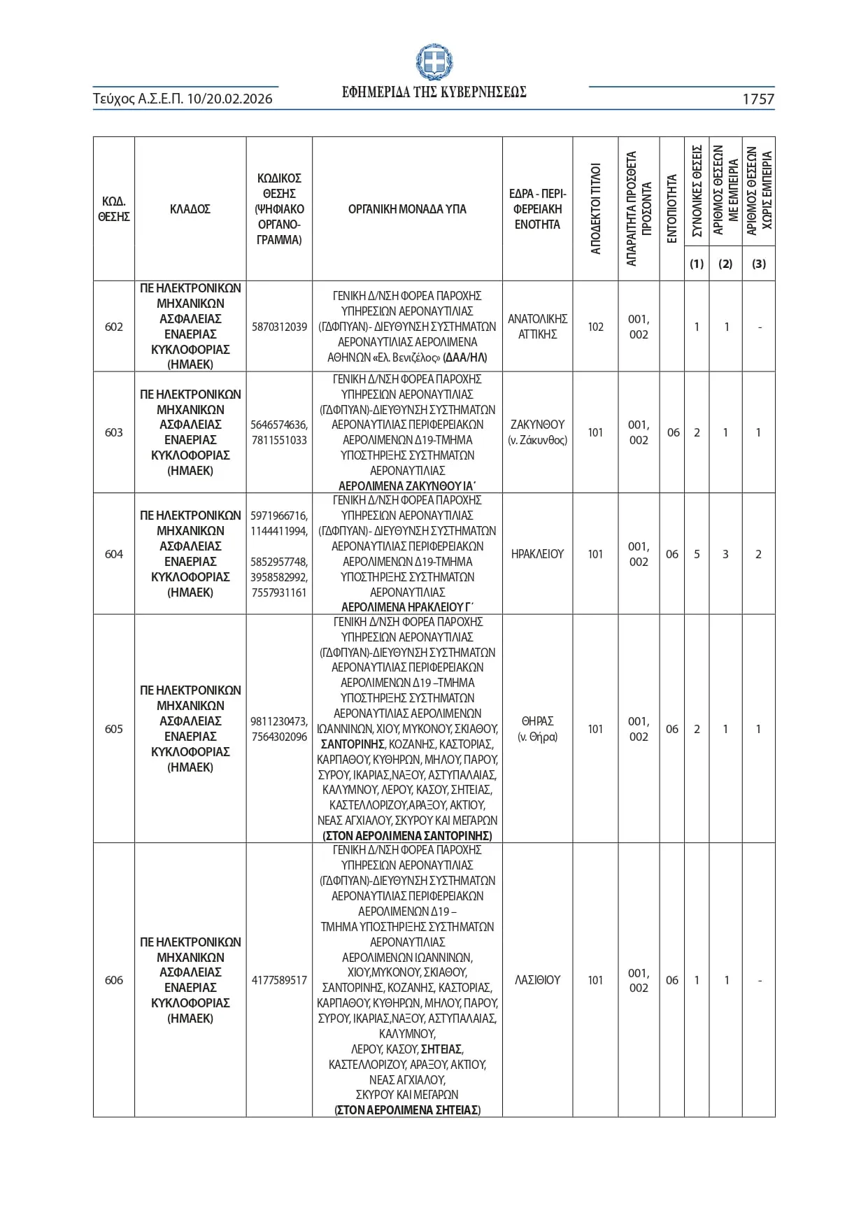 Δημοσιεύθηκε σε ΦΕΚ η προκήρυξη 3Κ/2026 του Ανώτατο Συμβούλιο Επιλογής Προσωπικού (ΑΣΕΠ), που αφορά την πλήρωση 43 μόνιμων θέσεων στην Υπηρεσία Πολιτικής Αεροπορίας (ΥΠΑ) των αεροδρομίων της χώρας, η οποία λειτουργεί υπό την εποπτεία του Υπουργείο Υποδομών και Μεταφορών.