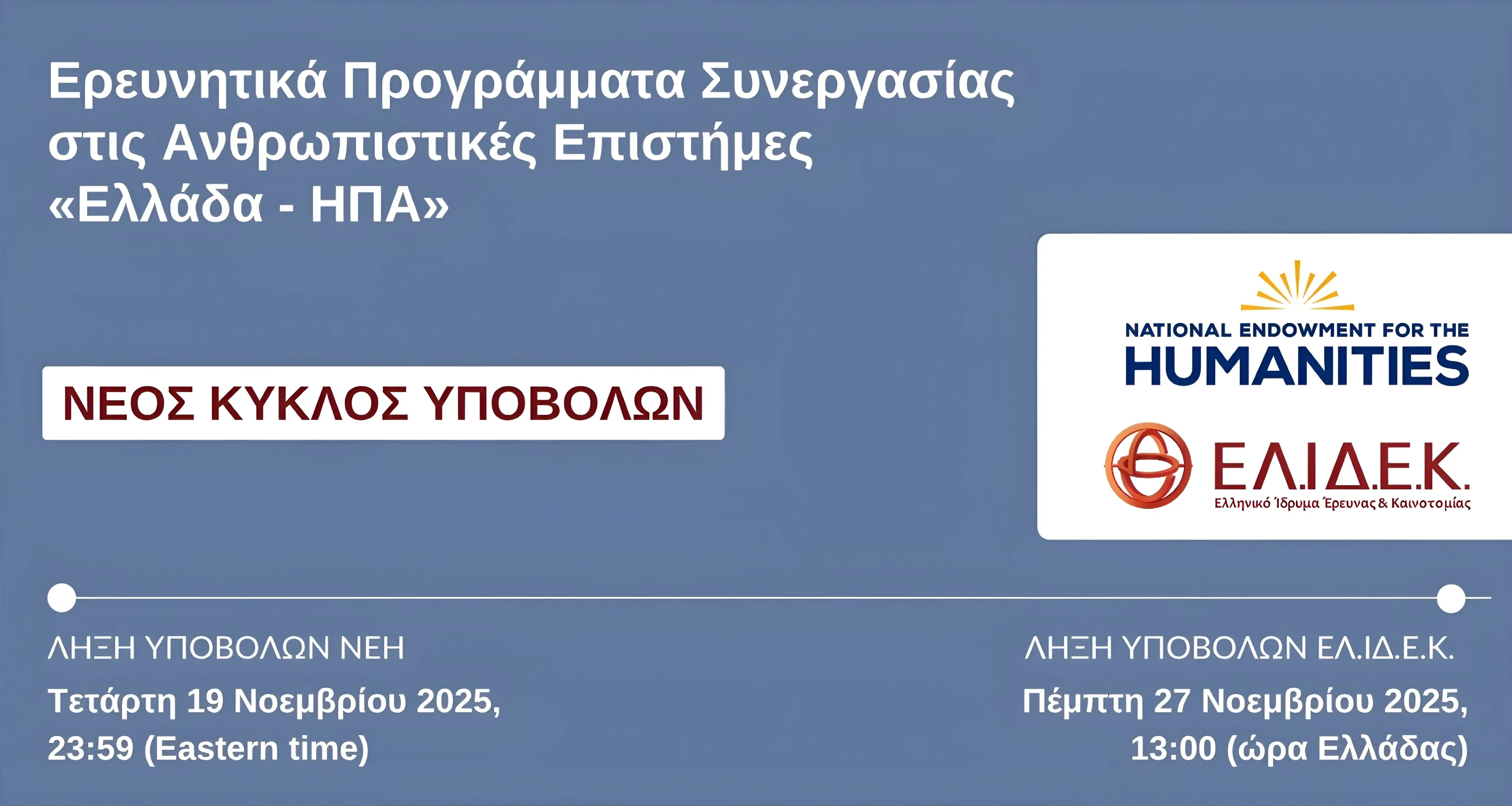 Το ΕΛΙΔΕΚ καλεί ερευνητές για τη 2η περίοδο υποβολής προτάσεων της προκήρυξης "Ερευνητικά Προγράμματα Συνεργασίας στις Ανθρωπιστικές Επιστήμες Ελλάδα-ΗΠΑ"